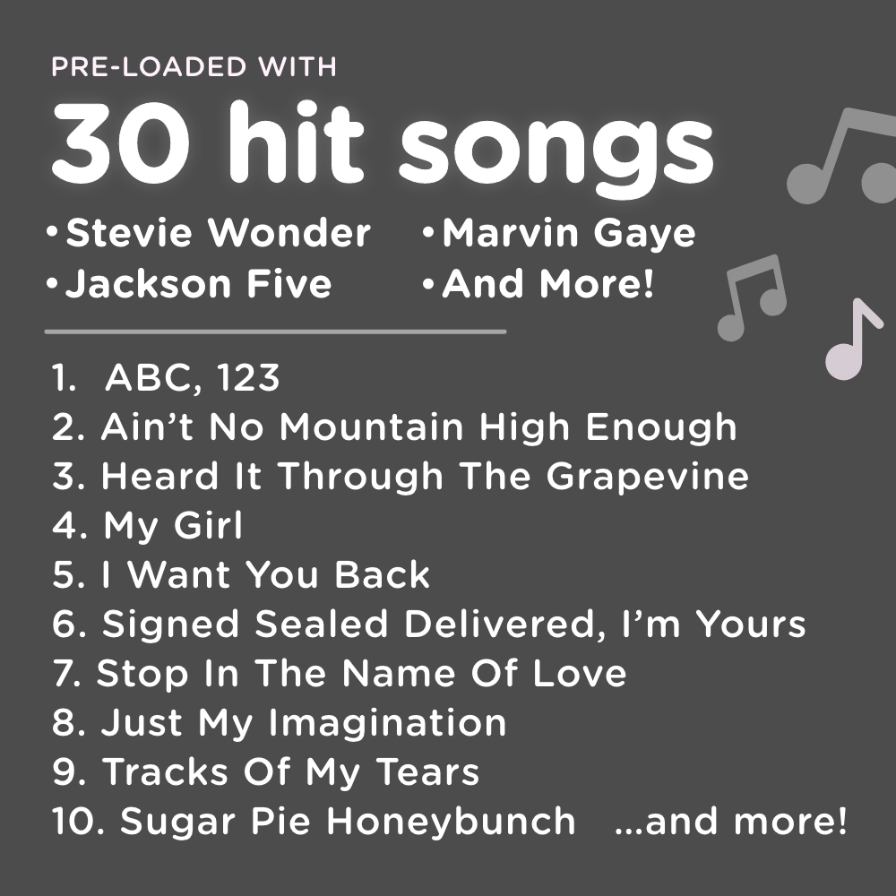 •  30 FAMOUS SONGS – Hit Motown Magic songs by artists like Stevie Wonder, Jackson 5, and Marvin Gaye include “Superstition”, “ABC”, and “my girl”